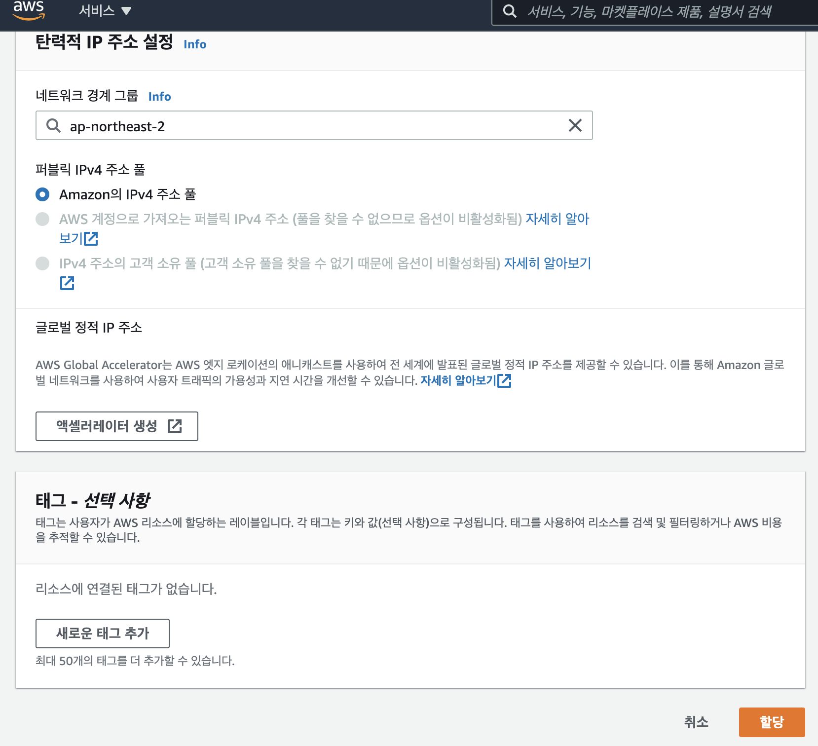 1. EC2 메뉴 - 네트워크 및 보안 - 탄력적 IP - [탄력적 IP 주소 할당] 선택