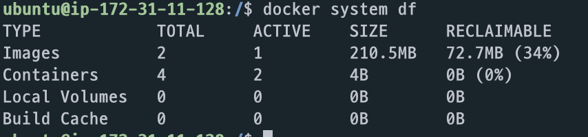 $ docker system prune # 정지된 컨테이너, 실행중인 컨테이너 이미지 외의 이미지, 볼륨, 네트워크 삭제