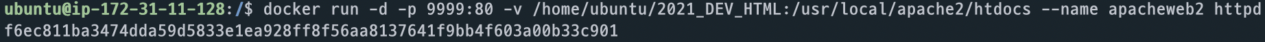 $ docker run -d -p 9999:80 -v /home/ubuntu/2021_DEV_HTML:/usr/local/apache2/htdocs --name apacheweb2 httpd