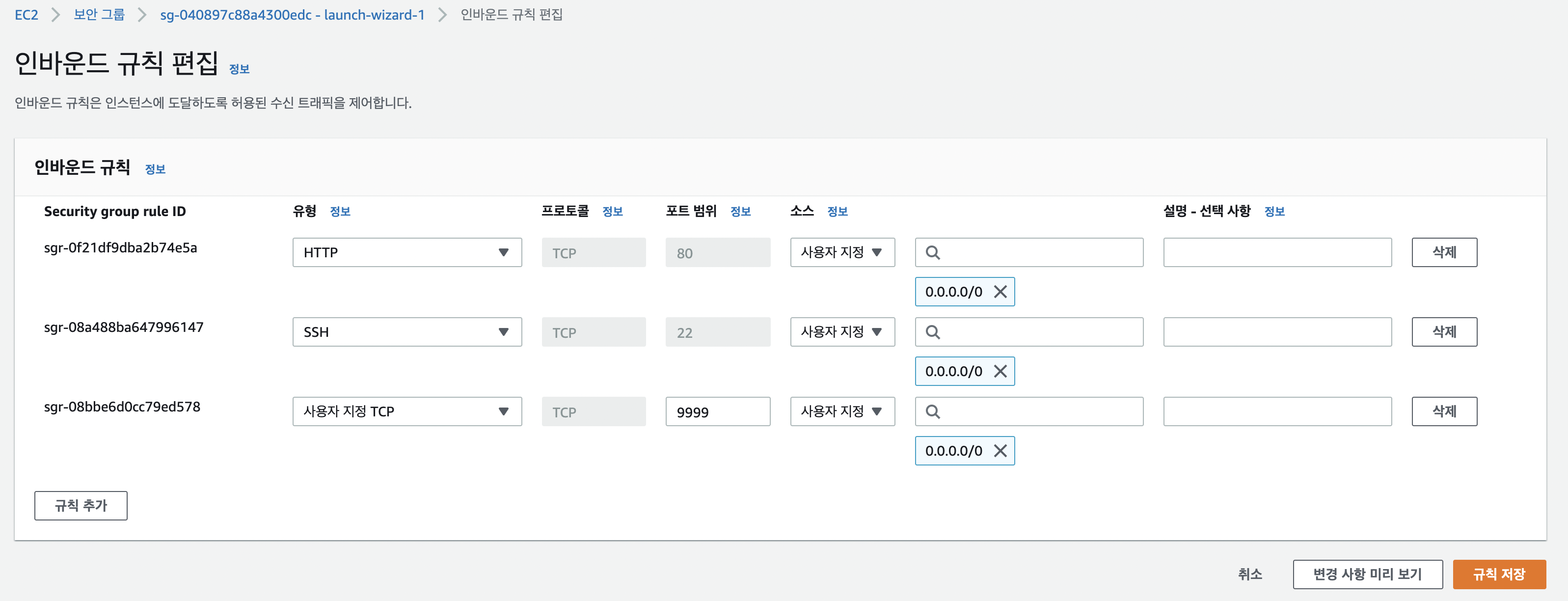 * aws에서 ec2의 보안에 들어가서 9999 허용을 해야함
