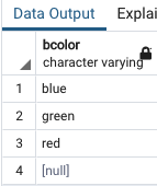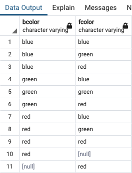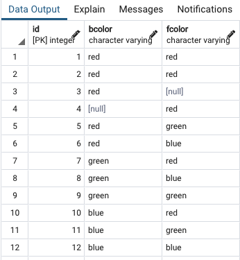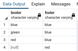 - bcolor와 fcolor를 모두 지정했기 때문에 Postgre의 SELECT DISTINCT는 행의 고유성 평가를 위해 두 개를 결합했습니다.
