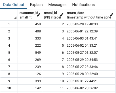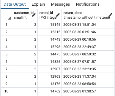 -- rental반환 날짜가 2005-05-27다음 과 같은 테이블 에서 고객 ID 목록을 반환합니다 .