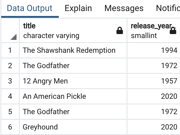 - UNION연산자가 하나의 중복 행을 제거 하기 때문에 결과 집합에는 결과 집합에 5개의 행이 포함됩니다 .
