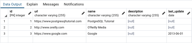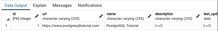 VALUES('https://www.postgresqltutorial.com','PostgreSQL Tutorial');
