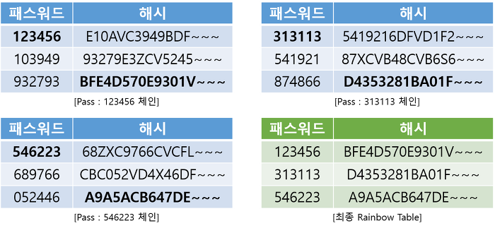 레인보우 어택 : 미리 해시 값들을 계산해 놓은 테이블인 rainbow table이라는 테이블을 먼저생성해놓은 후 해시 값을 역추적해서 본래 값을 찾아내는 해킹 방식