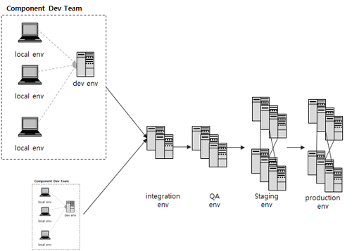 * 경우에 따라 integration, qa, staging은 요구사항에 따라 합쳐지거나 별도 운영될 수 있음